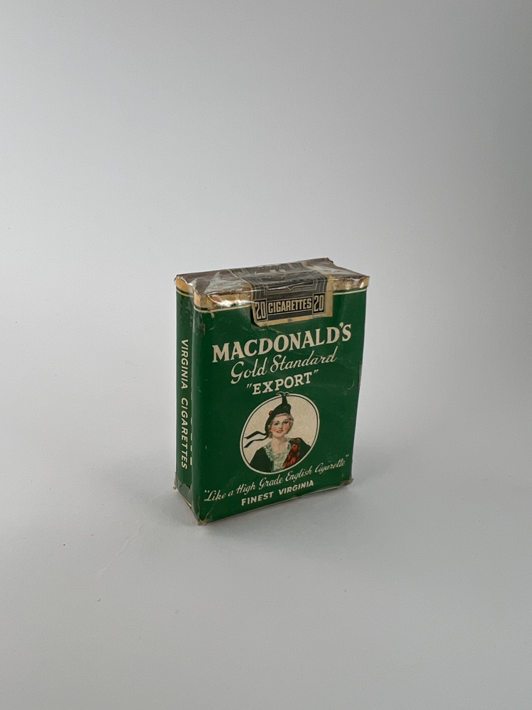 Aprašymas: Šis senovinis „Macdonald’s Gold Standard Export“ cigarečių pakelis, pažymėtas „Finest Virginia“ ženklu, išsiskiria žaliu fonu ir tipišku portretiniu moters atvaizdu. Gamintojas – W.C. Macdonald Inc., įsikūręs Monrealyje, Kanadoje. Ant pakelio nurodyta, kad prekės ženklas žinomas jau daugiau nei 90 metų. Tai aukštos kokybės angliško tipo tabako cigaretės, skirtos eksportui, kas nurodoma ir pačiame dizaino centre.