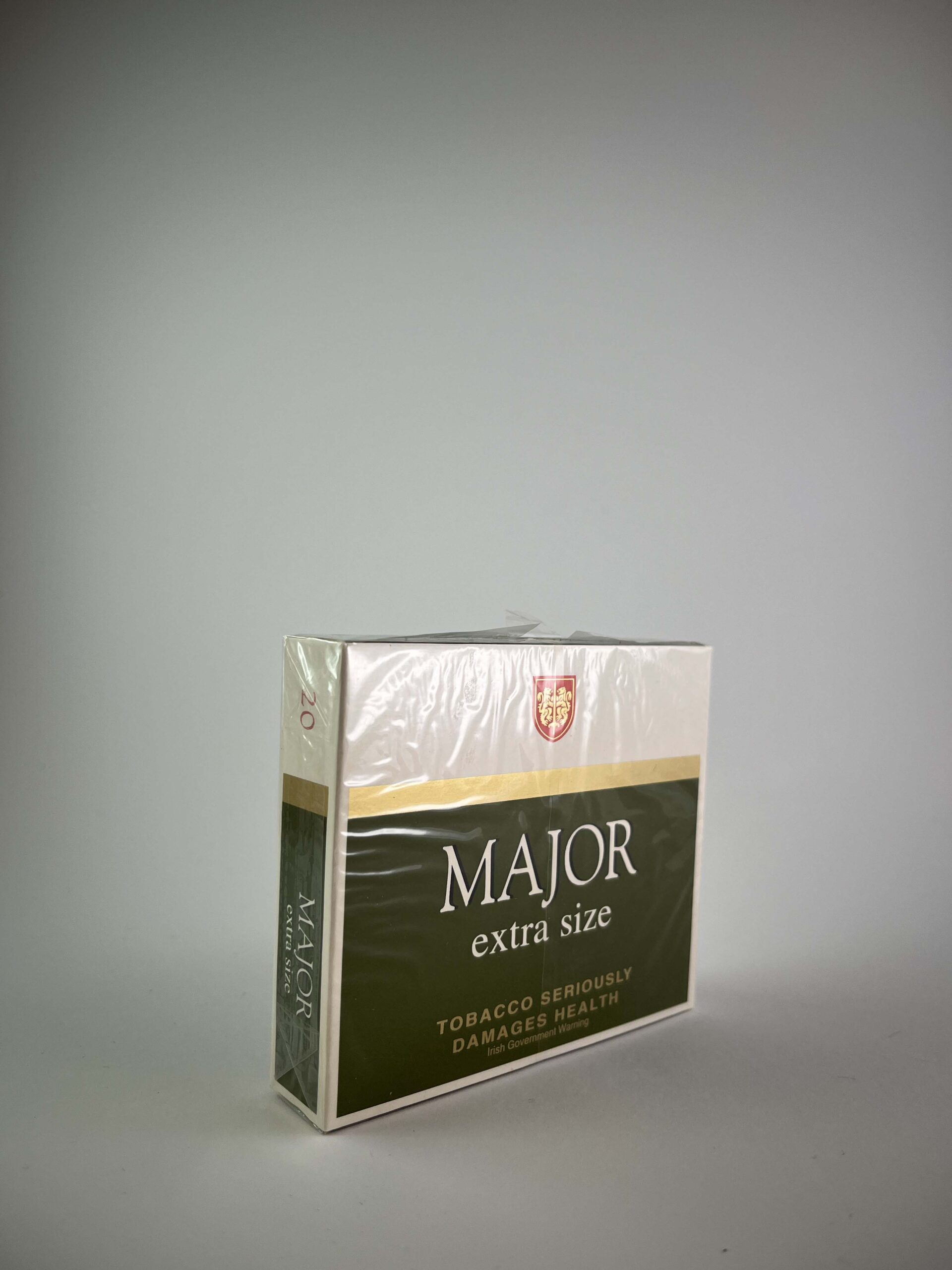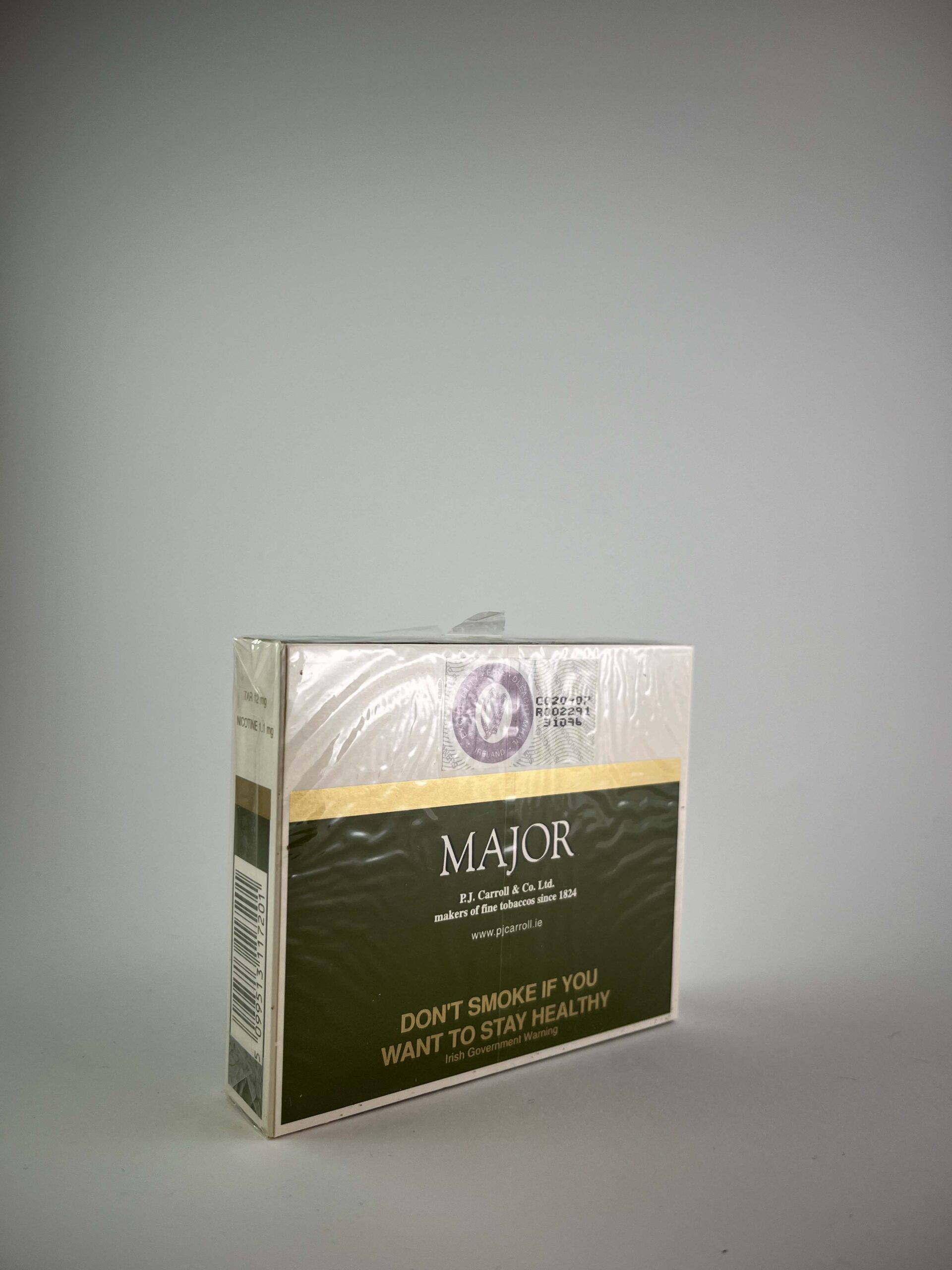 Aprašymas: MAJOR „Extra Size” cigarečių pakelis išsiskiria paprastu, tačiau solidžiu dizainu. Tamsiai žalios spalvos fonas derinamas su auksinėmis detalėmis ir klasikiniu baltu šriftu. Šis dizainas pabrėžia prabangą ir tradicijas, o tekstai nurodo gamintoją „P.J. Carroll & Co. Ltd.“, turintį ilgą tabako gamybos istoriją nuo 1824 metų. Užrašas „Irish Government Warning“ patvirtina, kad gaminys skirtas Airijos rinkai, kas gali padidinti jo kolekcinę vertę, ypač už Airijos ribų.