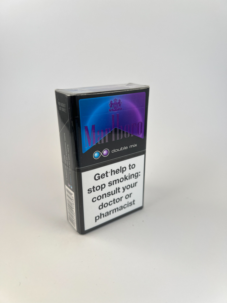 „Marlboro Double Mix“ – tai modernus, skoninis Marlboro leidimas, kuriame naudojama dviejų kapsulių sistema (dažniausiai mėtinė ir vaisinė skonio kombinacija). Pakelis išsiskiria ryškiu mėlynos–violetinės spalvų gradientu, blizgiu paviršiumi ir futuristiniu dizainu. Įspėjimai pateikti anglų kalba, kas rodo, kad šis pakelis skirtas tarptautinei rinkai (dažniausiai Pietryčių Azijos šalims ar Duty Free zonoms). Šone pažymėta: „FOR ADULT USE ONLY“ ir „DUTY FREE SALE ONLY“, kas dar labiau patvirtina platinimą ne vietinėje mažmeninėje prekyboje.