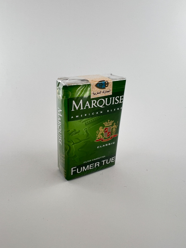 Aprašymas: Marquise Classic cigarečių pakelis pasižymi sodria žalia spalva, sidabriniais užrašais ir heraldiniu herbu, išdėstytu centre. Pakelis pažymėtas kaip „American Blend“ tipo produktas. Priekinėje dalyje nurodytas įspėjimas „FUMER TUE“, o viršuje yra oficialus Maroko muitinės lipdukas („Douanes Marocaines“), nurodantis produkto teisėtą platinimą šioje šalyje. Ant kairiojo šono pažymėta: 20 FILTER CIGARETTES. Dizainas tvarkingas ir orientuotas į frankofonišką rinką.