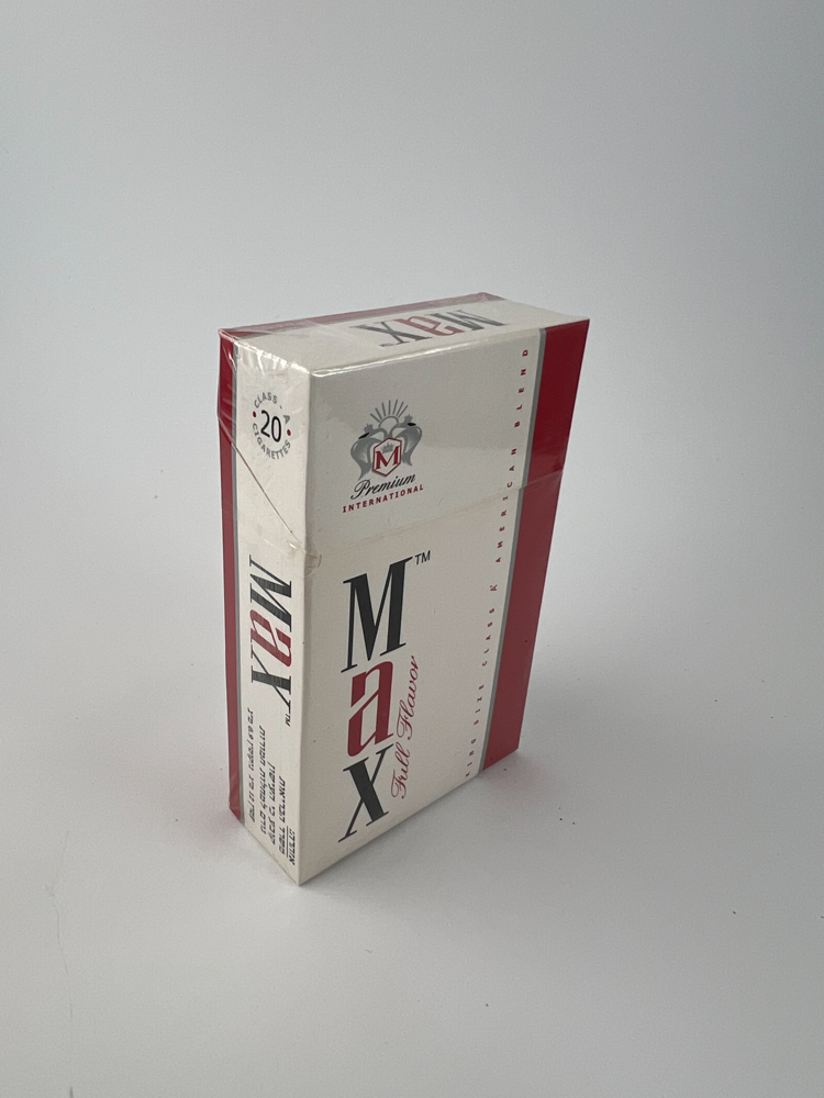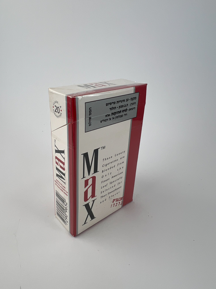 Aprašymas: MAX Full Flavor cigarečių pakelis pasižymi ryškiu, švariu dizainu – balta spalva derinama su raudonais akcentais ir kontrastingu prekės ženklo logotipu. Ant pakuotės nurodoma, kad šios cigaretės pagamintos iš geriausių amerikietiško tabako lapų, o tai pabrėžia jų aukštą kokybę ir prabangą. Įspėjimas apie rūkymo žalą pateiktas hebrajų kalba, o tai leidžia daryti išvadą, kad šis pakelis buvo skirtas Izraelio rinkai.