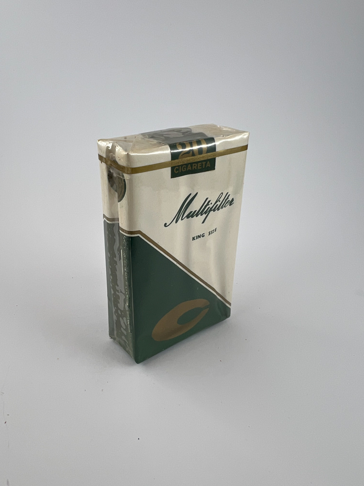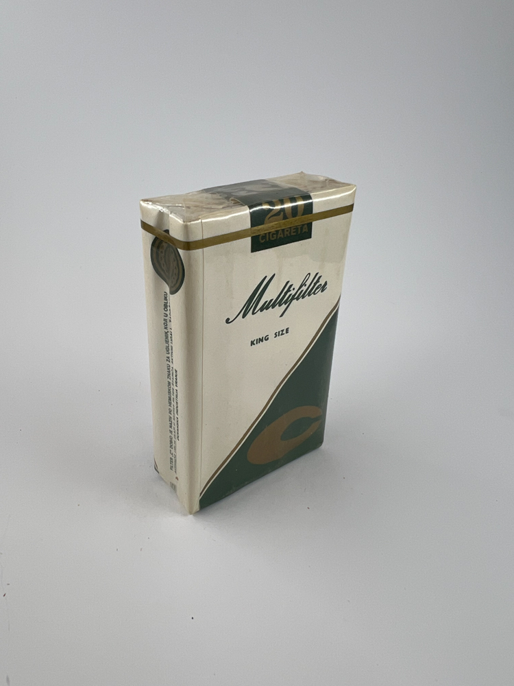 Aprašymas: „Multifilter King Size“ yra klasikinis jugoslaviškas cigarečių pakelis, išsiskiriantis šviesaus kremo spalvos ir žalsvo tono deriniu su stilizuota aukso spalvos grafika apatinėje dalyje. Pavadinimas „Multifilter“ parašytas elegantišku šriftu, o viršuje nurodoma „20 CIGARETA“. Šoninėse pusėse nurodyta gamintojo informacija – „Tvornica Duhana Zagreb“, kas rodo pakelio kilmę iš Kroatijos laikų, kai šalis dar buvo Jugoslavijos sudėtyje. Šis pakelis buvo skirtas vietinei ar regioninei rinkai ir atspindi tipinį laikmečio dizainą.