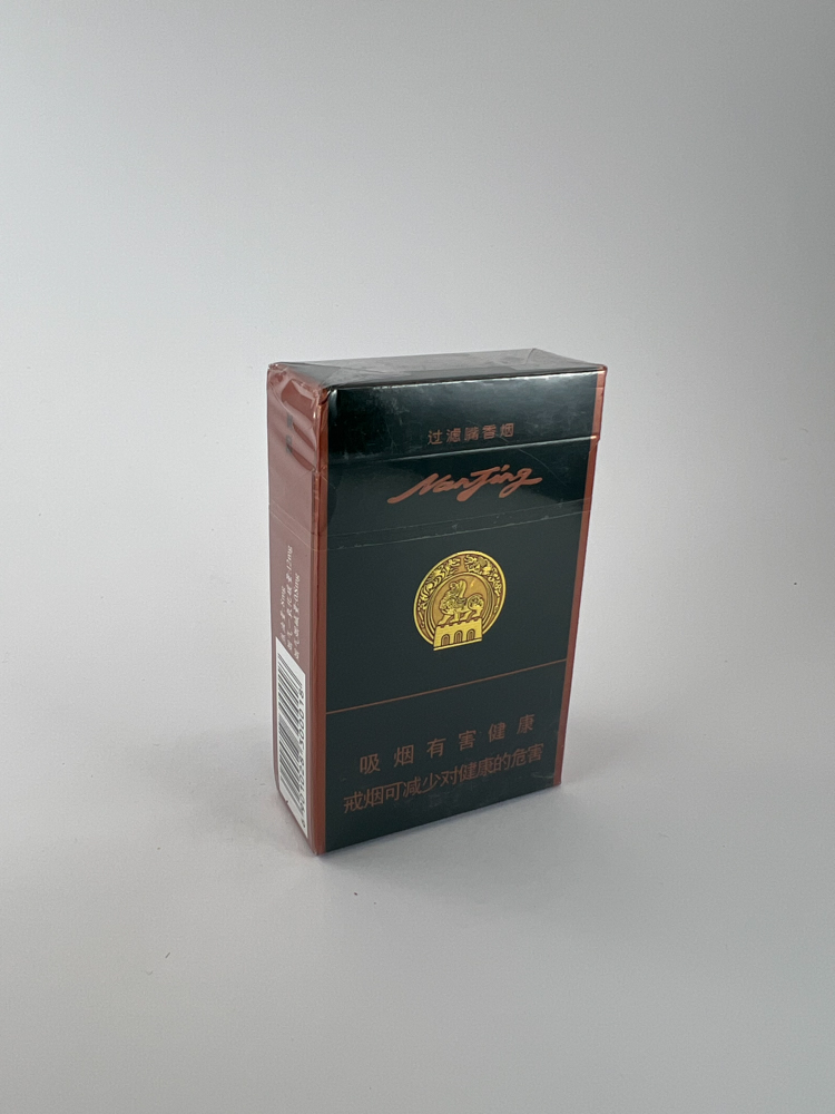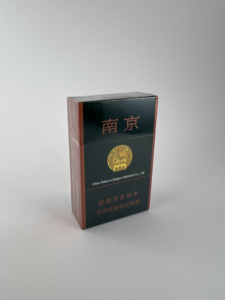Aprašymas: Stilingas juodos ir rudos spalvos dizainas, auksinis herbas centre, viršuje kiniški užrašai “南京” (Nanjing). Apačioje – kiniški sveikatos perspėjimai. Plėvelė nepažeista.