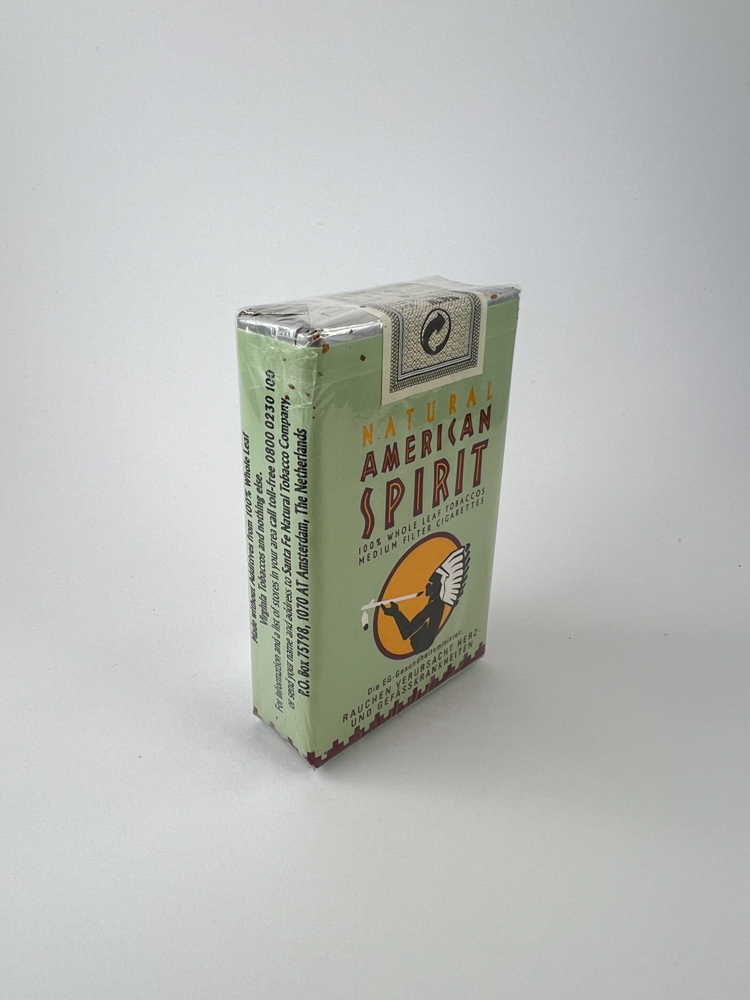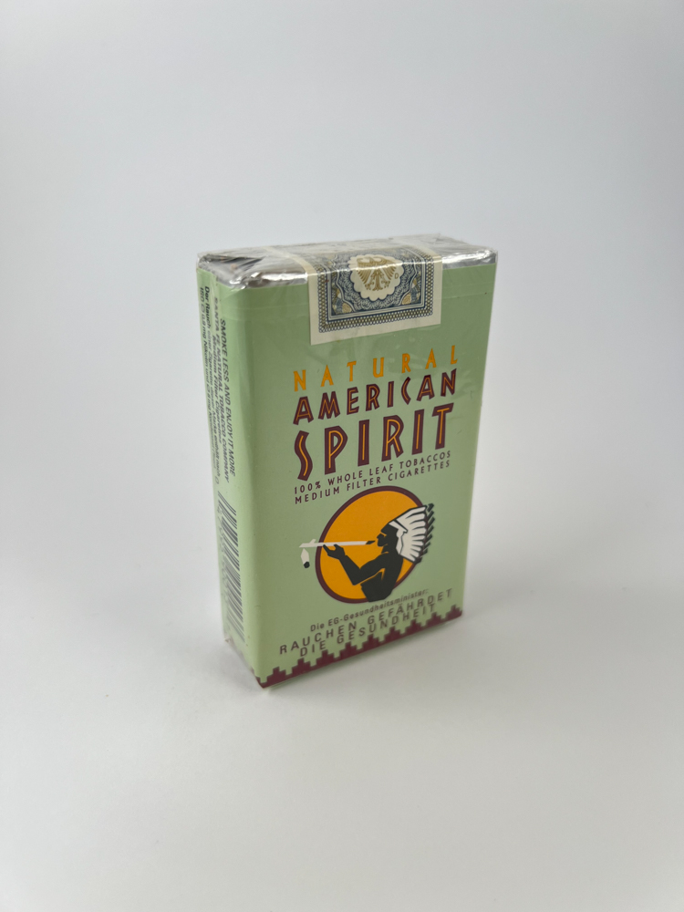 Aprašymas: Šis Natural American Spirit cigarečių pakelis pasižymi žalsvu fonu ir tradiciniu prekės ženklo simboliu – indėnu su taikos pypke geltoname apskritime. Tai medium filter versija, pagaminta iš 100 % neperdirbto tabako lapų („whole leaf tobaccos“). Ant pakelio pateiktas įspėjimas vokiečių kalba, rodo platinimą Vokietijoje ar kitose vokiškai kalbančiose šalyse. Pakelis nepažeistas, su originaliu sidabriniu sandarikliu viršuje.