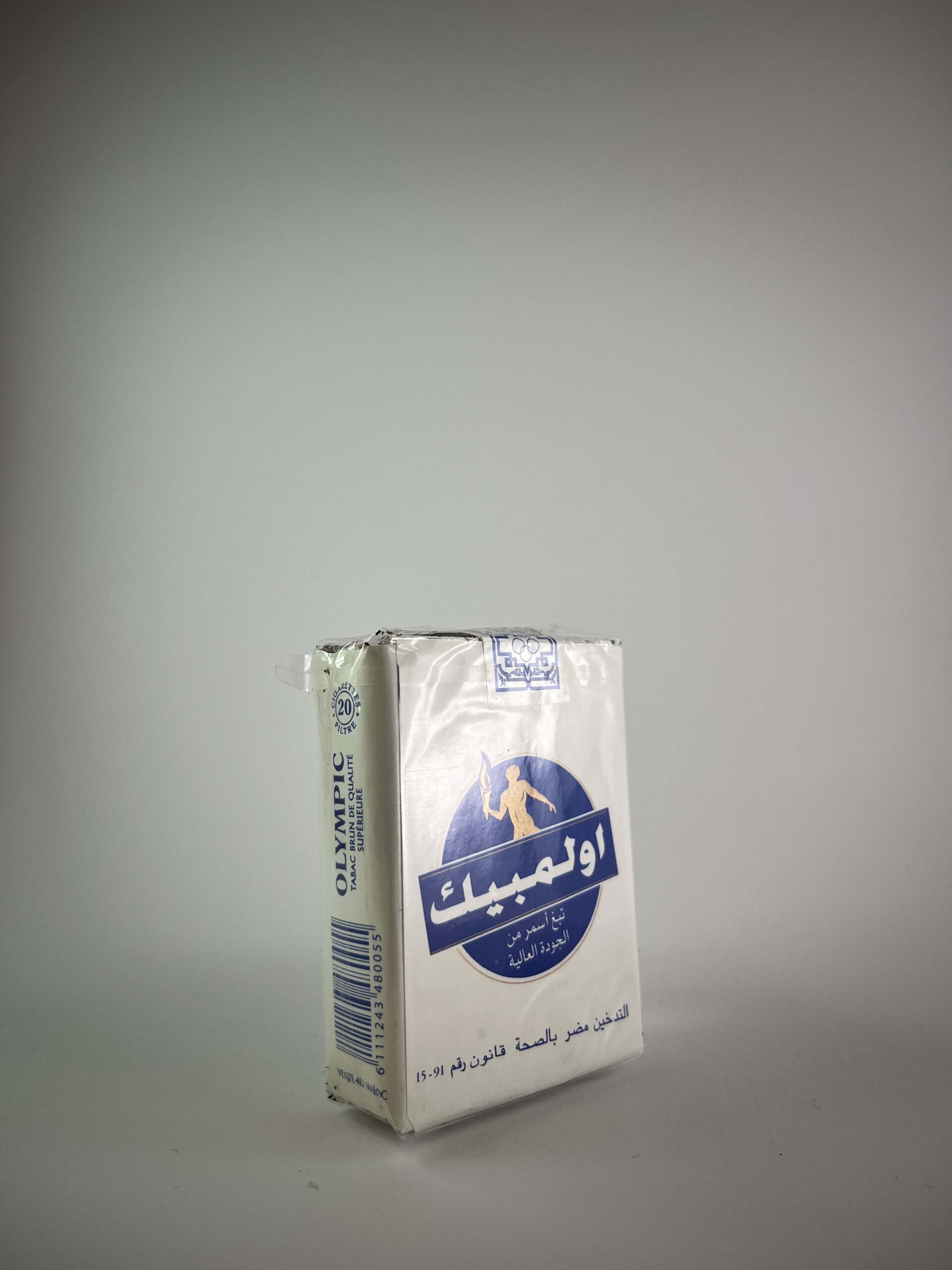Aprašymas: Šis „Olympic Regular Size“ cigarečių pakelis yra klasikinio dizaino, baltos ir mėlynos spalvų derinio. Pakelio centre puikuojasi sportininko su deglo simbolis, pabrėžiantis sportišką ir dinamišką tematiką. Užrašai prancūzų ir arabų kalbomis atspindi gaminio kilmę ir rinkos orientaciją. Sveikatos įspėjimas pateikiamas arabų kalba, o originali pakuotė nepažeista, tačiau yra nedidelių laikymo žymių.