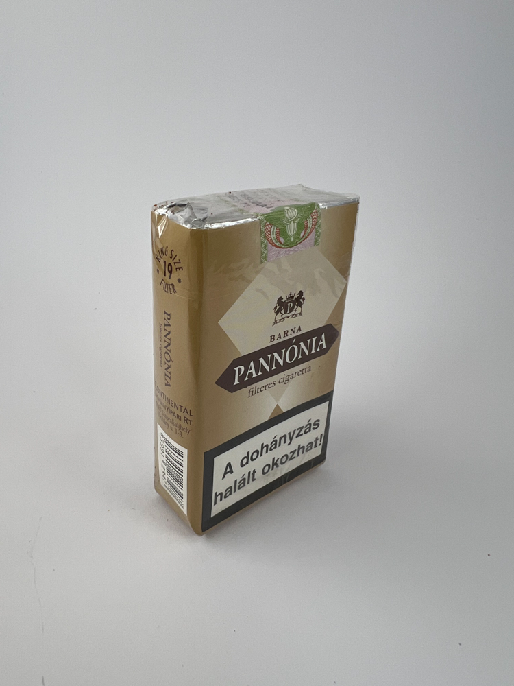 „Pannónia Barna“ – tai vengriškų cigarečių serija, kurios pavadinimas reiškia „rudasis“ (barna). Šis pakelis skirtas vidaus rinkai, ką rodo vengrų kalbos įspėjimai ir akcizo lipdukas. Pakuotės dizainas minimalistinis – vyrauja rusvai gelsva spalva su geometriniu logotipu ir užrašu „King Size Filter – 19 db“ (db = vienetai). Akcizo lipdukas ir plėvelė rodo, kad pakelis nebuvo atidarytas.