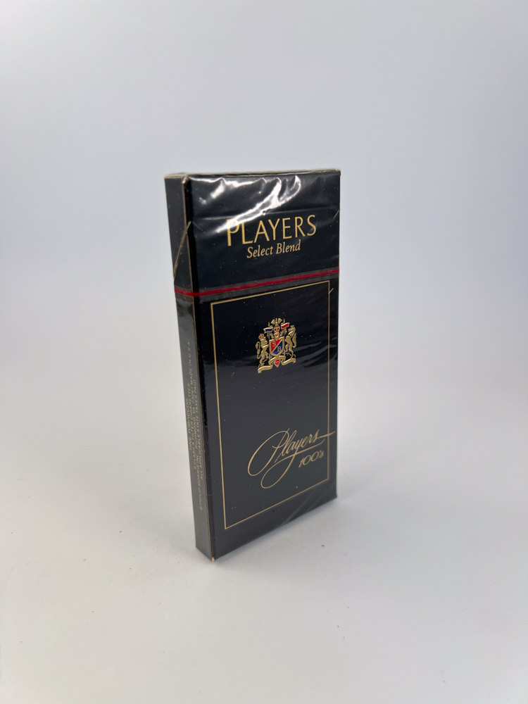 Tai elegantiškas „Players Select Blend 100’s“ pakelis, pagamintas Imperial Tobacco Canada Ltd. juodos spalvos fone su auksiniu rėmeliu ir subtiliomis raudonomis detalėmis. Centre pavaizduotas herbas su „Player’s“ simbolika, o apačioje – klasikinis „Players 100’s“ logotipas, parašytas kursyvu.