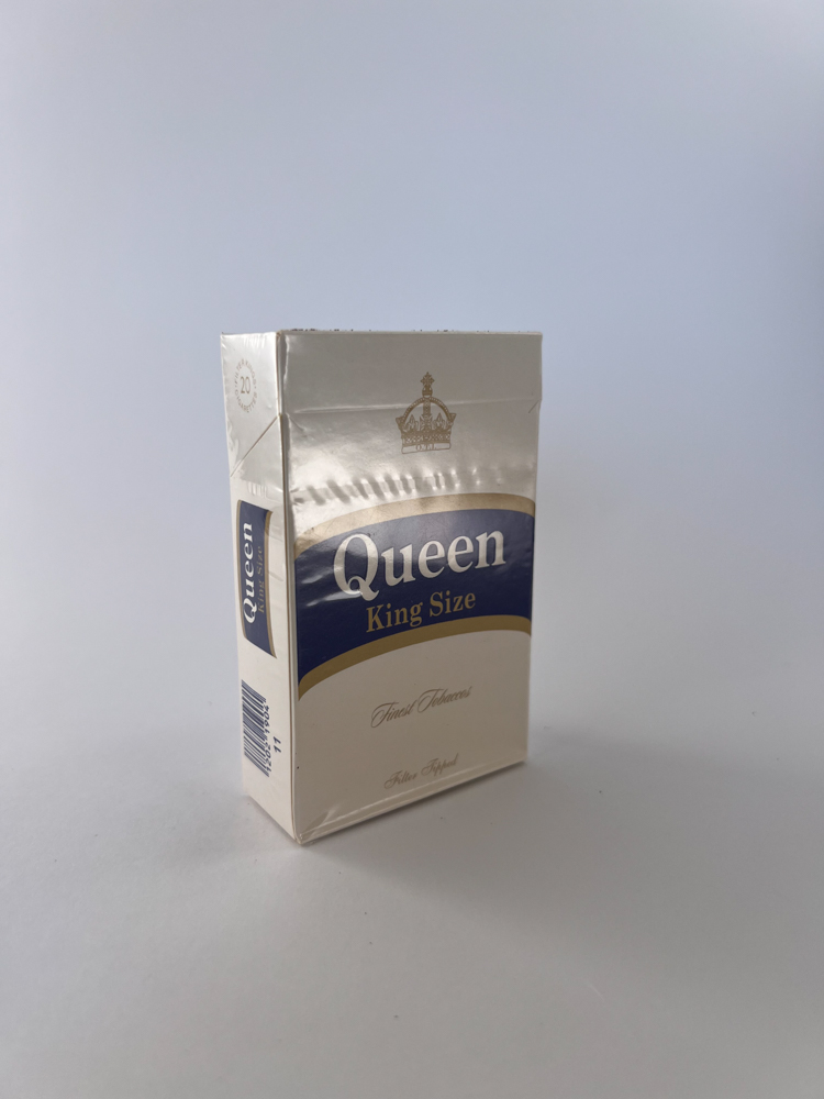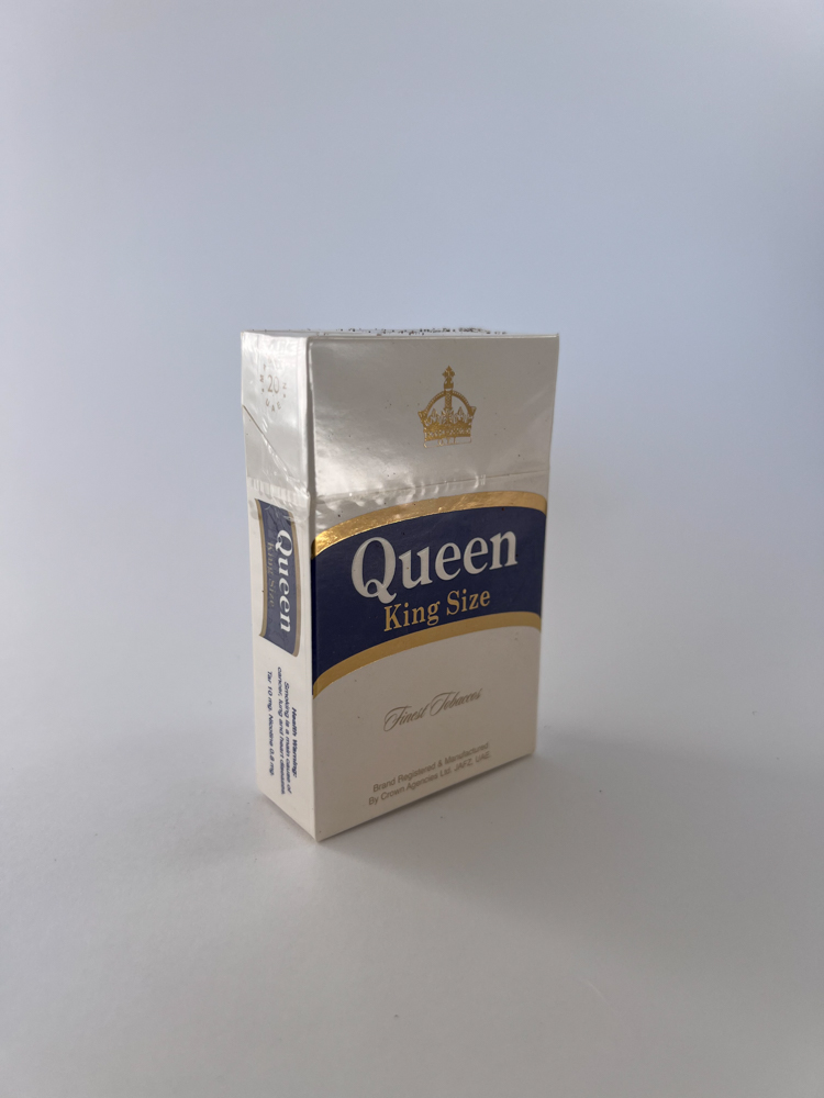 Aprašymas: „Queen King Size“ – tai cigarečių pakelis, gaminamas pagal užsakovą „Crown Agencies Ltd.“ Jungtiniuose Arabų Emyratuose. Pakelio dizainas minimalistinis ir klasikinis, baltas su mėlyna centrine juosta, paauksuotu užrašu „Queen“ bei karūnos simboliu viršuje. Pridėta frazė „Finest Tobaccos“ sustiprina prekinį įvaizdį kaip aukštos kokybės produkto. Tai pavyzdys iš Artimųjų Rytų rinkai skirtų vidutinės klasės cigarečių, dažnai matytų tarptautinėse duty free zonose ar ne ES šalyse.