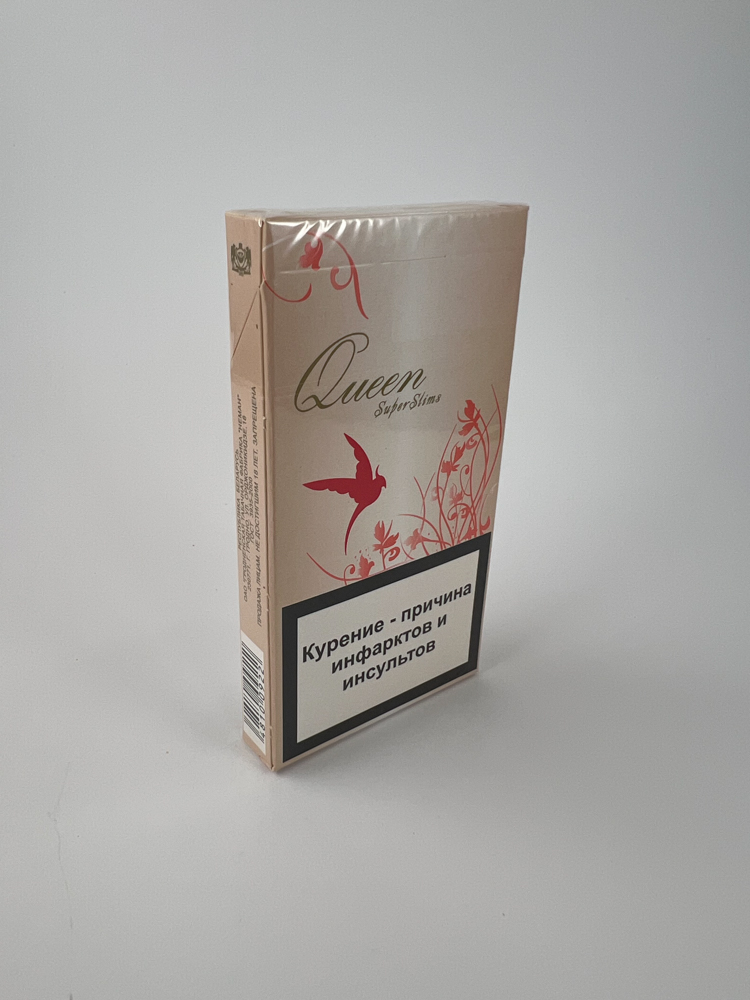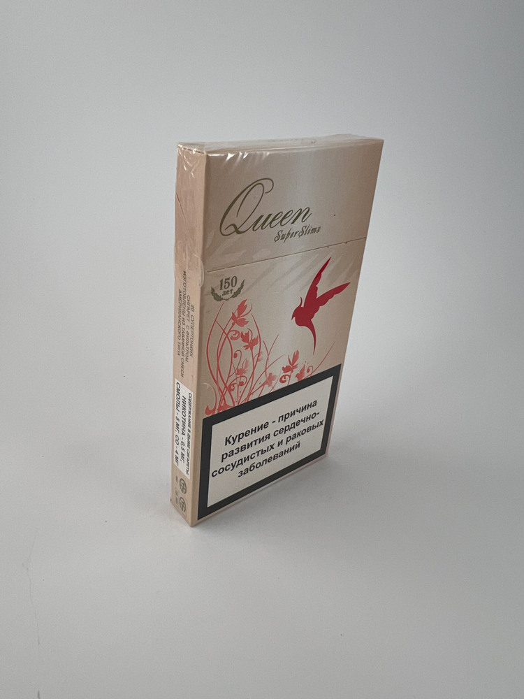 „Queen Super Slims“ cigarečių pakelis išsiskiria subtiliu smėlinės spalvos dizainu su raudonos spalvos paukščiu ir gėlių ornamentais. Pakelis skirtas paminėti 150 metų jubiliejų (ant šono nurodyta „150 лет“), todėl turi išskirtinį leidimo požymį. Suprojektuotas itin plonoms („super slims“) cigaretėms, šis pakelis akivaizdžiai orientuotas į moterų auditoriją. Įspėjimai pateikti rusų kalba, o pakelis neatidarytas, su apsaugine plėvele. Šoninėse pusėse matomas kodavimas ir gamybos informacija.