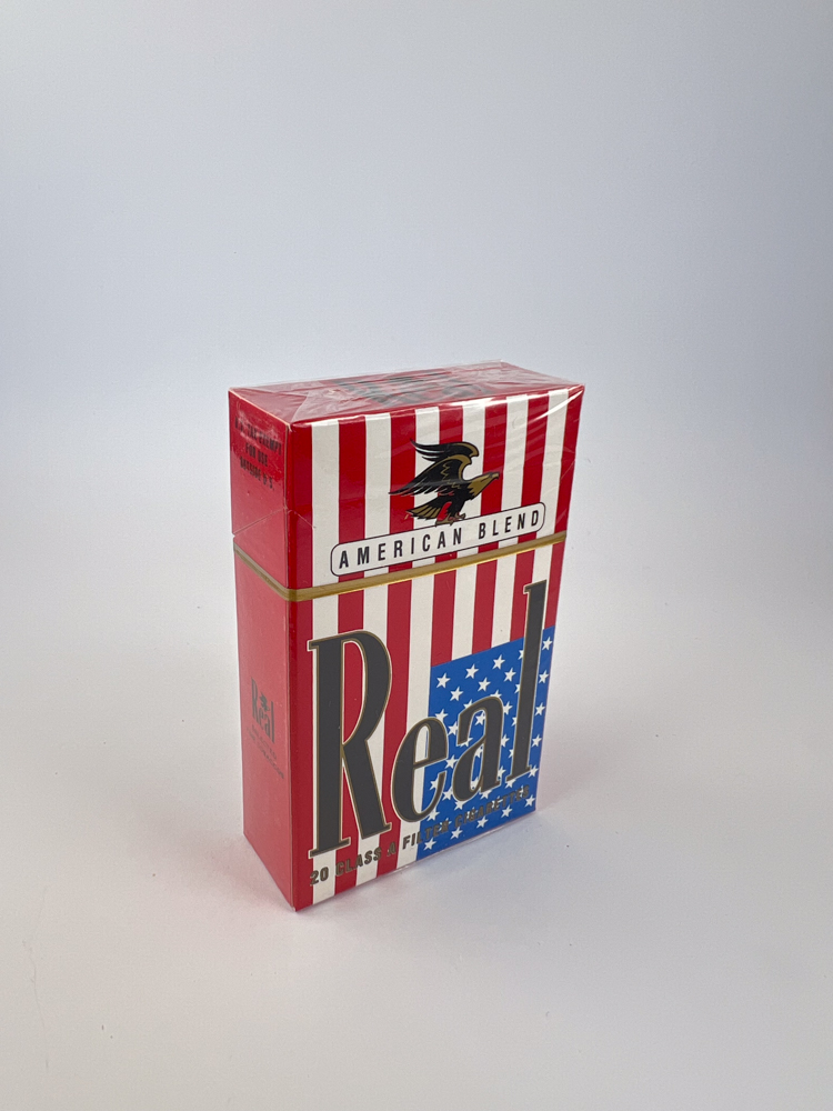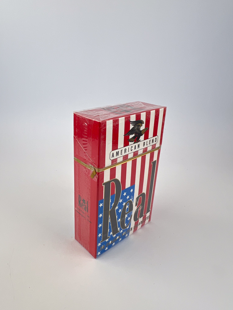 Pakuotės dizainas aiškiai remiasi JAV vėliavos motyvais – vertikalios raudonai baltos juostos, mėlynas kvadratas su žvaigždutėmis ir didelis sidabrinis logotipas „Real“. Viršuje matomas juodo erelio simbolis, lydimas užrašo American Blend, kuris reiškia tabako mišinio tipą, pagamintą iš „Virginia“, „Burley“ ir „Oriental“ veislių.