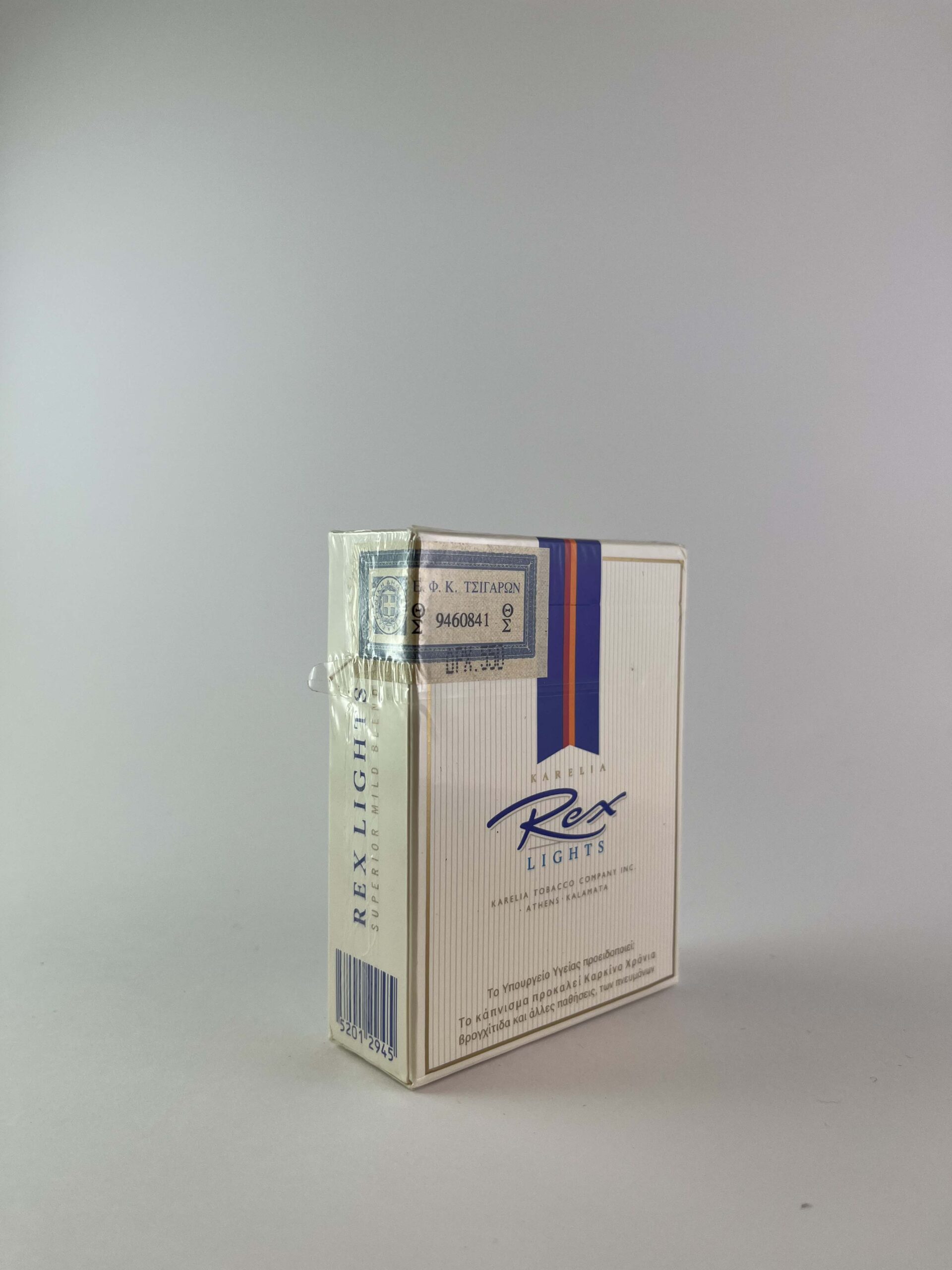 Aprašymas: Šis Rex „Lights” cigarečių pakelis pasižymi šviesiu, subtiliai elegantišku dizainu, kuris atspindi prabangos ir kokybės įvaizdį. Balta pakuotės spalva derinama su mėlynais ir oranžiniais akcentais, o logotipas ir užrašai perteikia prestižą ir tradiciją, būdingą Karelia Tobacco Company produkcijai. Pakuotė taip pat turi ryškų įspėjimą apie rūkymo žalą, kuris atitinka šiuolaikinius sveikatos apsaugos standartus.