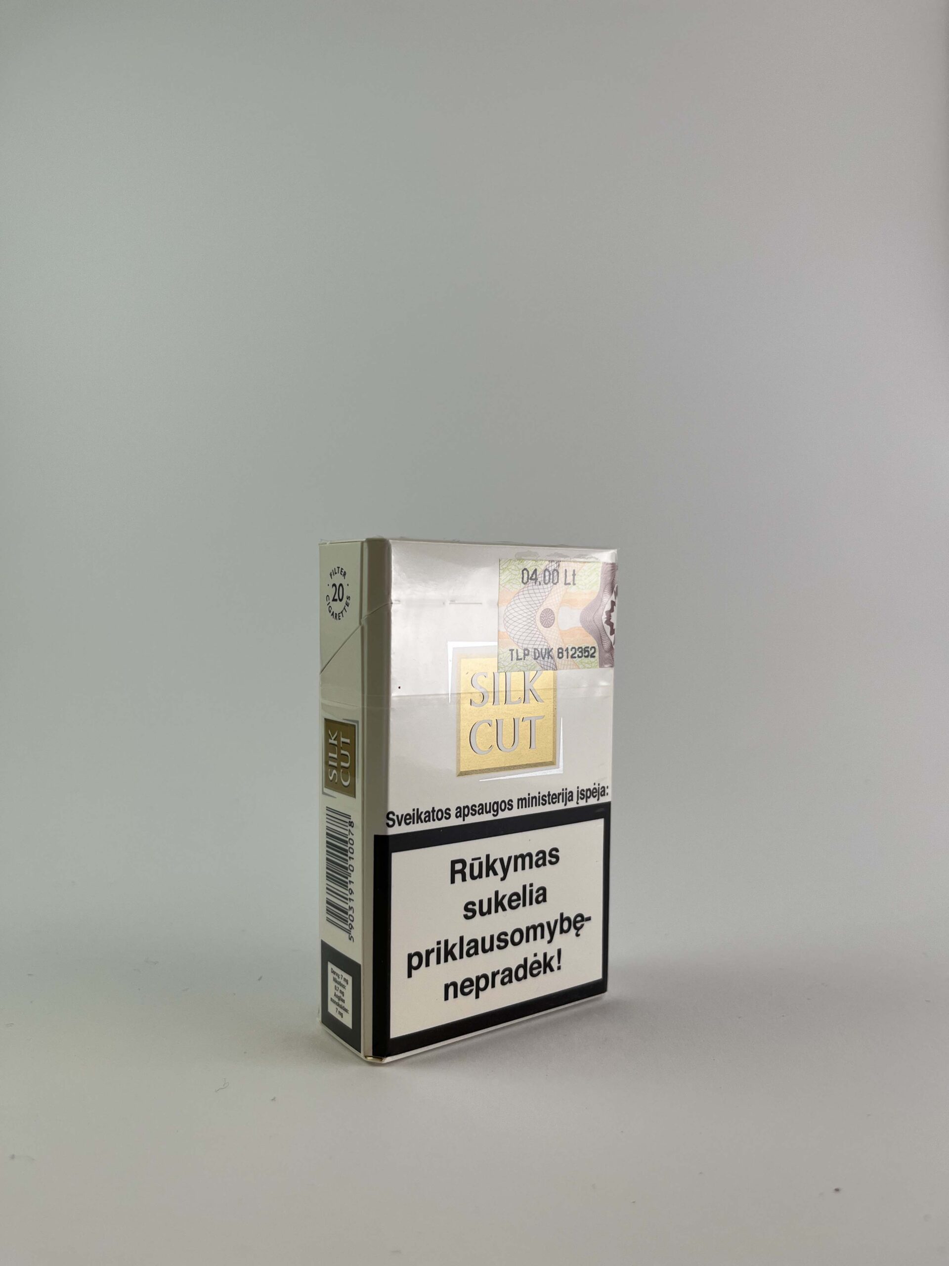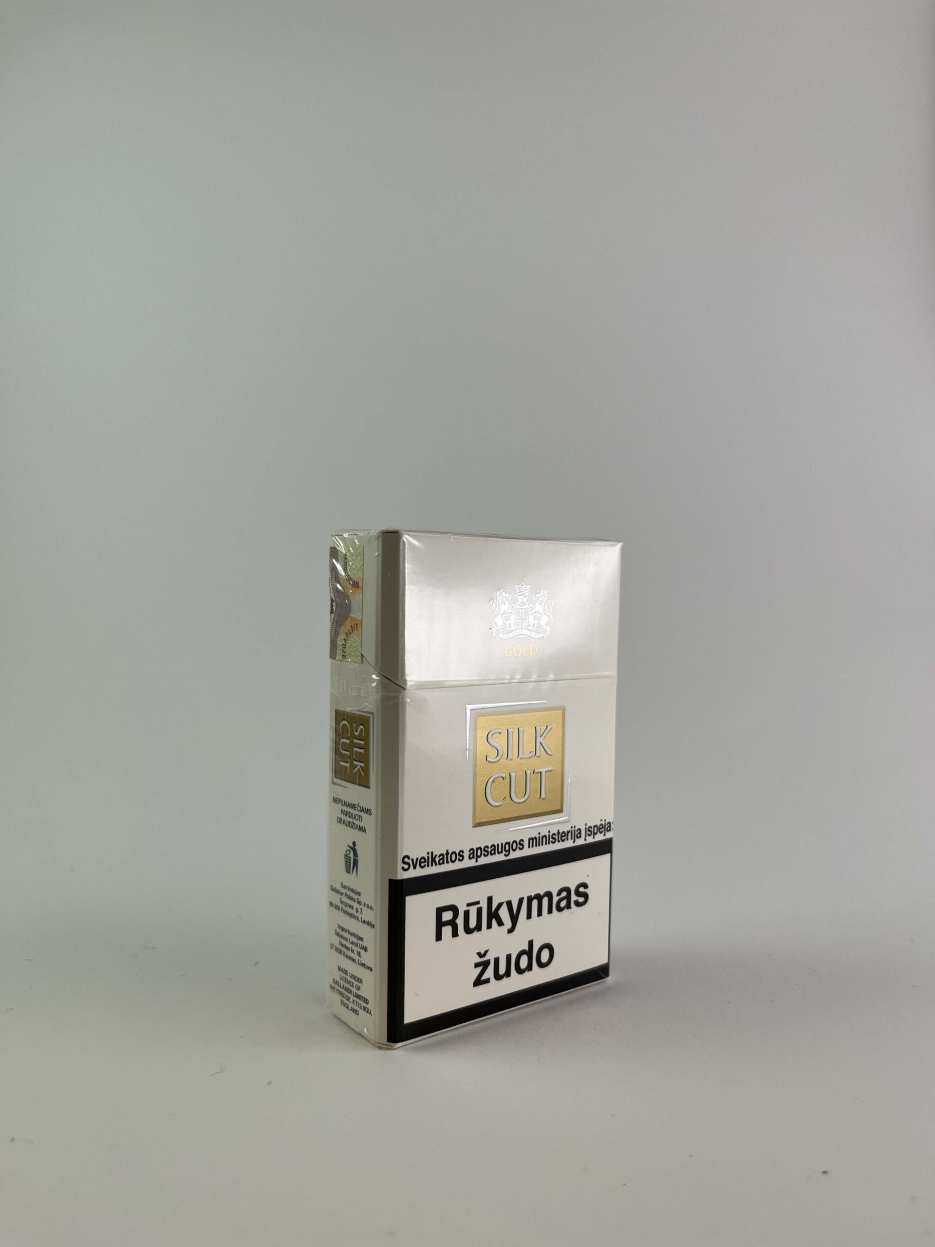Aprašymas: Šis „Silk Cut Gold” cigarečių pakelis pasižymi elegantišku ir minimalistiniu dizainu su subtiliu aukso logotipu ant balto fono. „Silk Cut” yra žinomas kaip švelnesnių cigarečių prekinis ženklas, siejamas su rafinuotumu ir aukšta kokybe. Įspėjimas apie rūkymo žalą yra išryškintas apačioje, primenant sveikatos riziką.