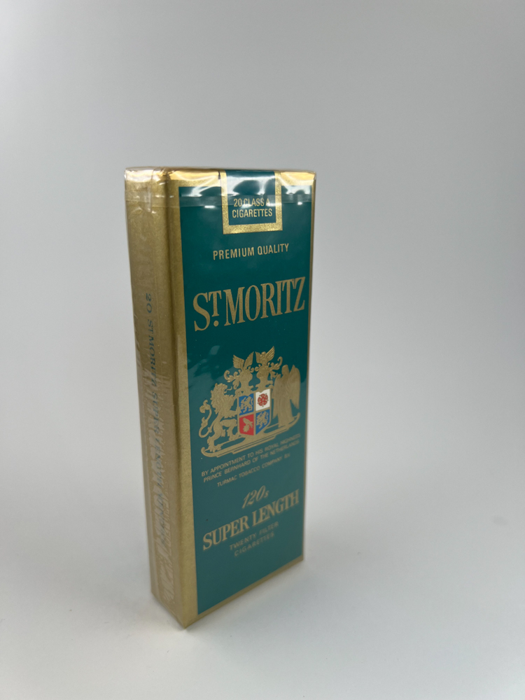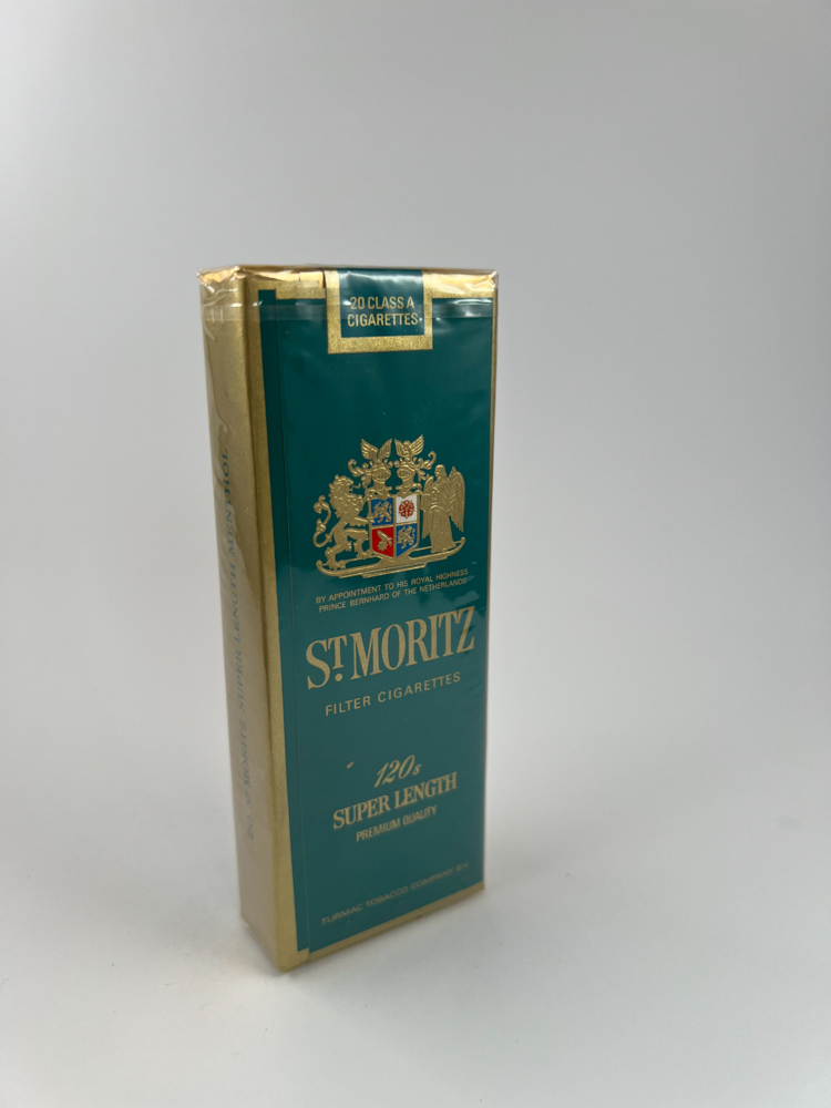 Aprašymas: Šis „St. Moritz“ cigarečių pakelis yra elegantiško ir išskirtinio dizaino, išsiskiriantis žaliu fonu su auksinėmis detalėmis. Pakelis pailgas, skirtas 120 mm ilgio cigaretėms – vadinamosioms „Super Length“. Priekinėje pusėje pateiktas herbas ir užrašas „By Appointment to His Royal Highness Prince Bernhard of the Netherlands“, liudijantis istorinę asociaciją su Nyderlandų karališkąja šeima. Gamybos ženklas nurodo T.T.I. (TURMAC TOBACCO COMPANY B.V.), kuri buvo gerai žinoma kaip prabangių cigarečių gamintoja. Dizainas perteikia prabangą ir prestižą, skirtas aukštesnei vartotojų klasei.