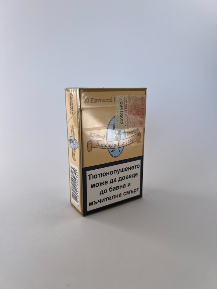 „Sunday’s Fantasy“ – tai nestandartinio dizaino cigarečių pakelis su ryškiu vizualiniu identitetu. Šviesiai rudo atspalvio fonas, iliustracija su baroko stiliaus figūra ir senoviniu raštu parašytas pavadinimas primena senoviškus plakatus. Pakuotė angliškai pažymi, jog tai „20 Flavoured Filter Cigarettes“, kas rodo, kad cigaretės turėjo kvapą ar skonį (greičiausiai vanilinį ar vaisinį). Įspėjimai apie rūkymo žalą yra bulgarų kalba, o viršuje matomas Bulgarijos akcizo lipdukas.