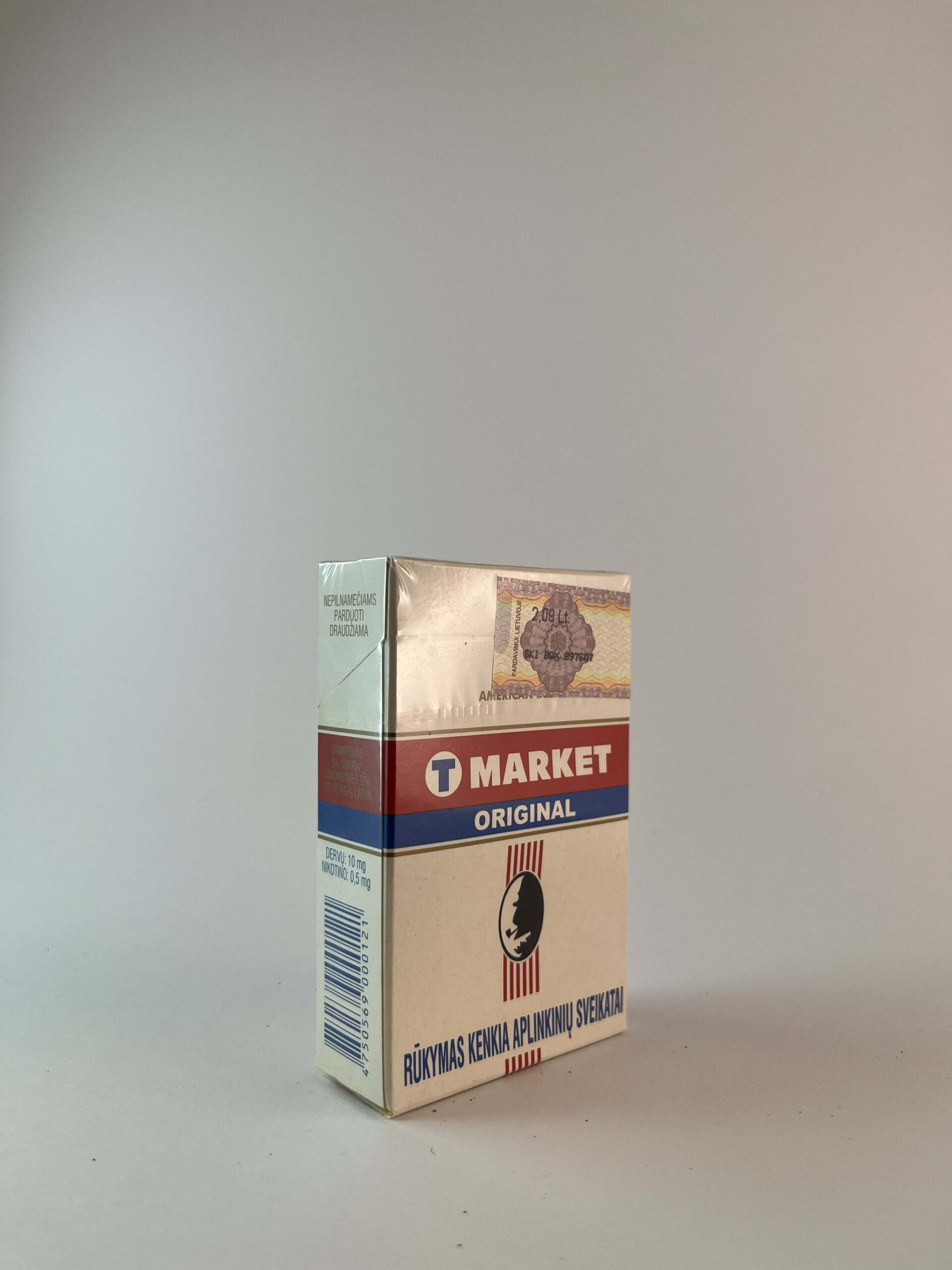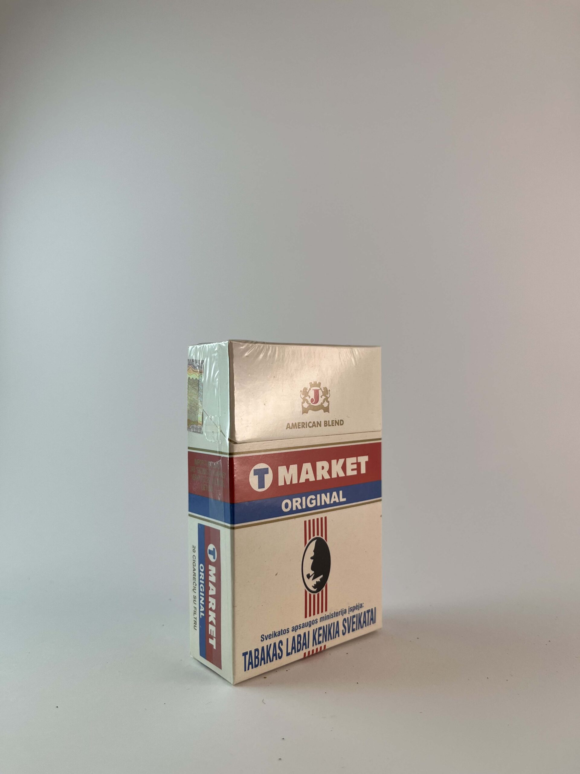Aprašymas: T Market Original cigarečių pakelis pasižymi klasikiniu, minimalistiniu dizainu su raudonais ir mėlynais akcentais ant šviesaus pagrindo. Pavadinimas „American Blend“ nurodo tabako rūšį, pabrėžiant Amerikos stiliaus tabako mišinį. Pakelyje ryškiai pavaizduoti sveikatos įspėjimai lietuvių kalba, kaip reikalaujama pagal vietos įstatymus, įspėjant apie rūkymo žalą sveikatai. Pakelis sukurtas šiuolaikinei rinkai ir orientuotas į paprastumą bei funkcionalumą.