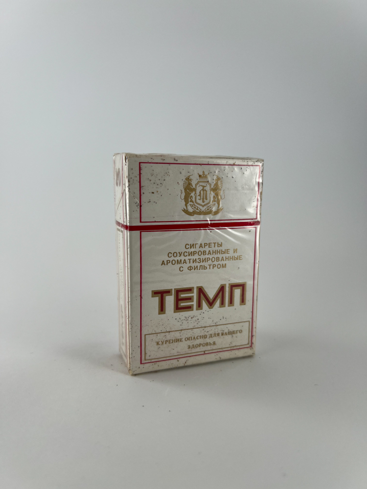 TEMP – tai aromatizuotų cigarečių prekės ženklas, kurio pavadinimas reiškia „tempas“ (greitis, ritmas). Pakelis dekoruotas dvikalbiu tekstu: rusų kalba (ТЕМП) ir rumunų kalba (TEMP), kas rodo, jog produktas buvo skirtas eksportui arba bendram Rytų Europos vartotojui. Dizainas minimalistinis – baltas fonas, raudonos ir auksinės detalės, herbiniai simboliai. Pakelis išlaikė originalų celofano sluoksnį, nors kai kur matyti senėjimo ženklai (dėmelės, oksidacija).