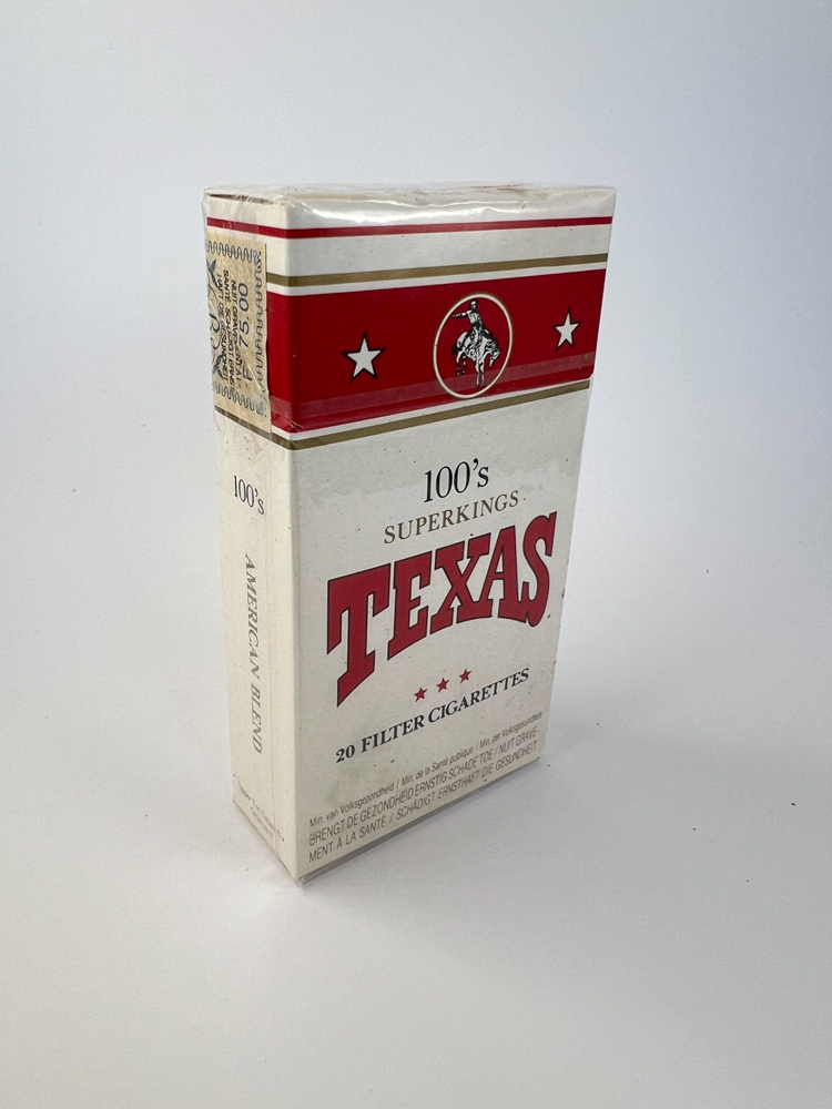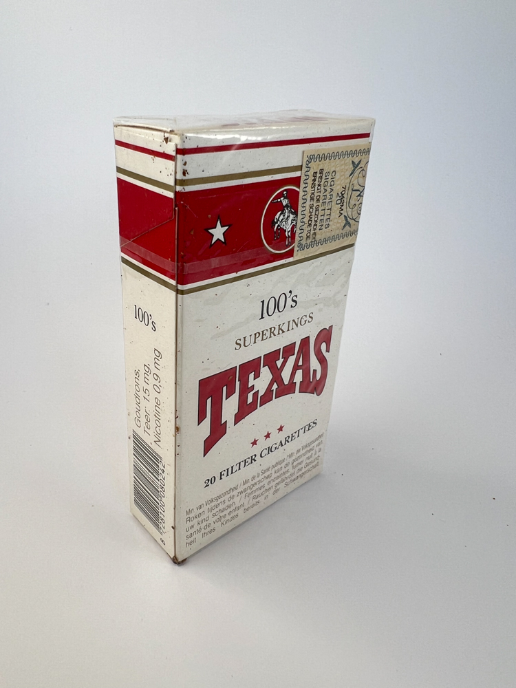 Aprašymas: Šis „TEXAS 100’s Superkings“ cigarečių pakelis perteikia laukinių vakarų dvasią. Raudonai baltas dizainas su kovbojaus simboliu ir žvaigždėmis viršuje sukuria stiprų asocijatyvų ryšį su JAV Teksaso tematika. Užrašas „American Blend“ šone nurodo mišinio tipą, o pakuotėje matomas vertikalus įspėjimas sveikatai keliose Europos kalbose rodo, kad pakelis buvo skirtas Europos rinkai. 100 mm ilgio cigaretės pozicionuojamos kaip „Superkings“ – ilgesnės ir prabangesnės. Tačiau pakelio būklė – su defektais: matomos paviršinės dėmės, celofano raukšlės, kampų pažeidimai.