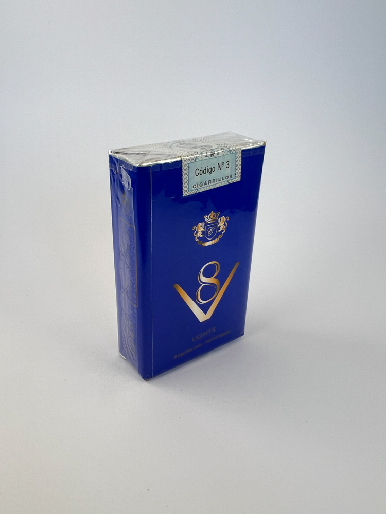 Šis V8 „Lights“ cigarečių pakelis yra intensyvios mėlynos spalvos, dekoruotas aukso spalvos logotipu su stilizuotu skaičiumi „8“ ir raide „V“. Dizainas modernus, minimalus ir orientuotas į šviesaus skonio rūkalų liniją. Viršuje matomas argentinietiškas mokesčių lipdukas „Código Nº 3“ ir nurodyta „IMP. INT. LEY 24.674“. Ant šoninės pakelio pusės pateiktas užrašas „Producto para adultos“, o pakelio dizainas aiškiai orientuotas į vietinę Argentinos rinką.