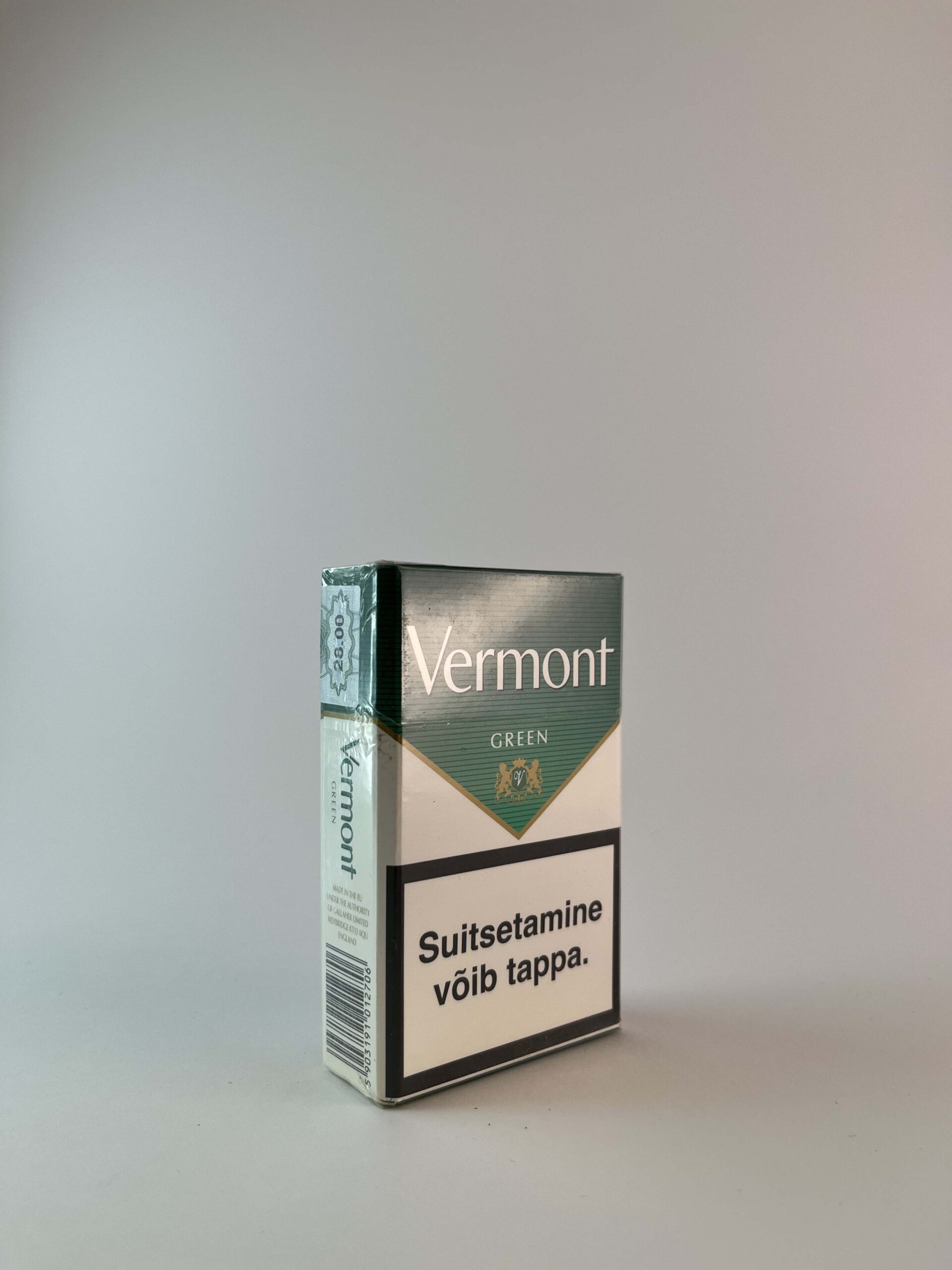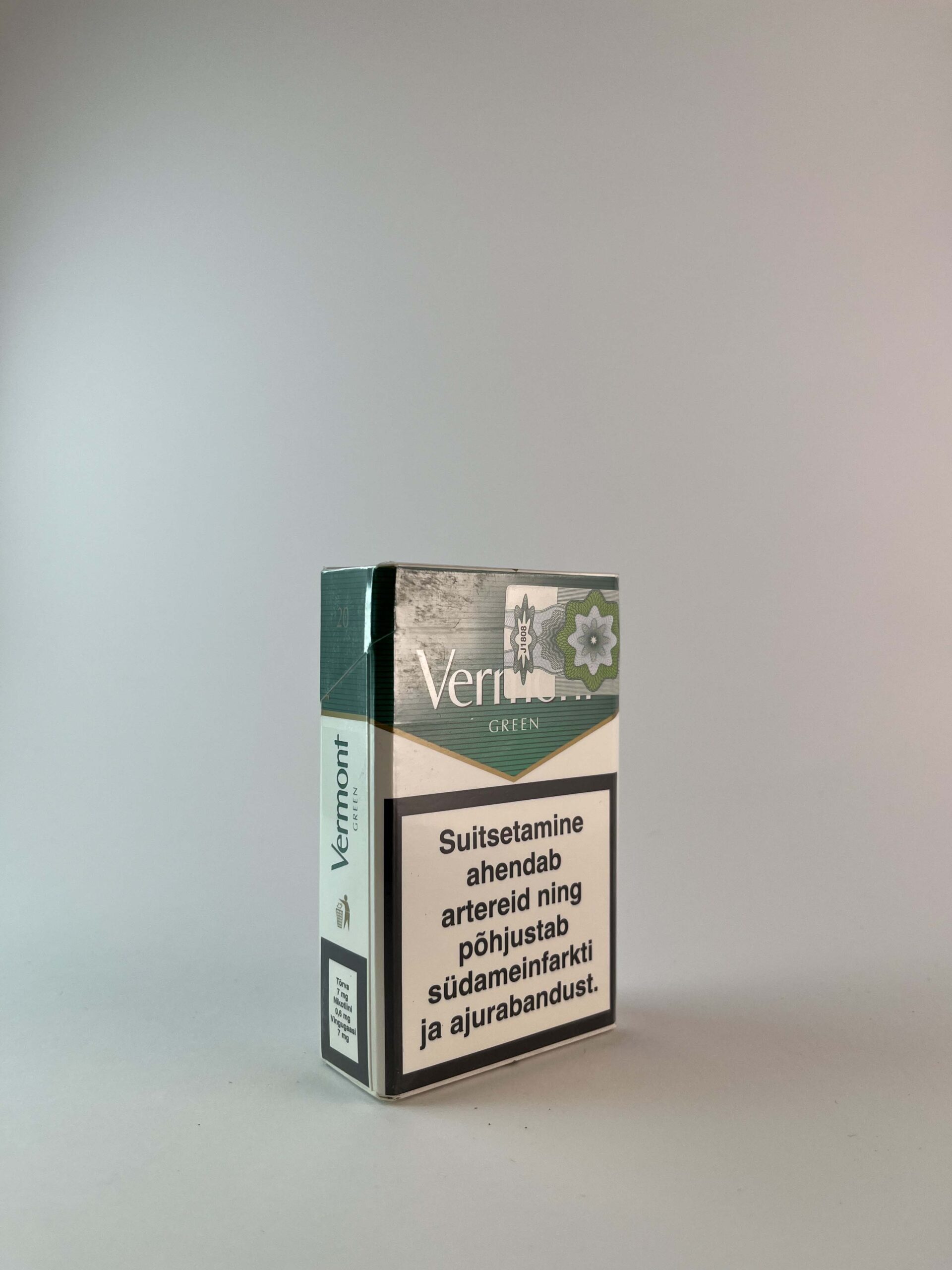 Aprašymas: Šis „Vermont Green“ cigarečių pakelis yra elegantiško dizaino, su žalia spalva ir subtiliomis dekoratyvinėmis detalėmis. Jis išsiskiria savo minimalistiniu stiliumi ir aiškiai matomu prekės ženklu. Pakelio įspėjimas apie rūkymo žalą ryškiai pabrėžia sveikatos pavojus.