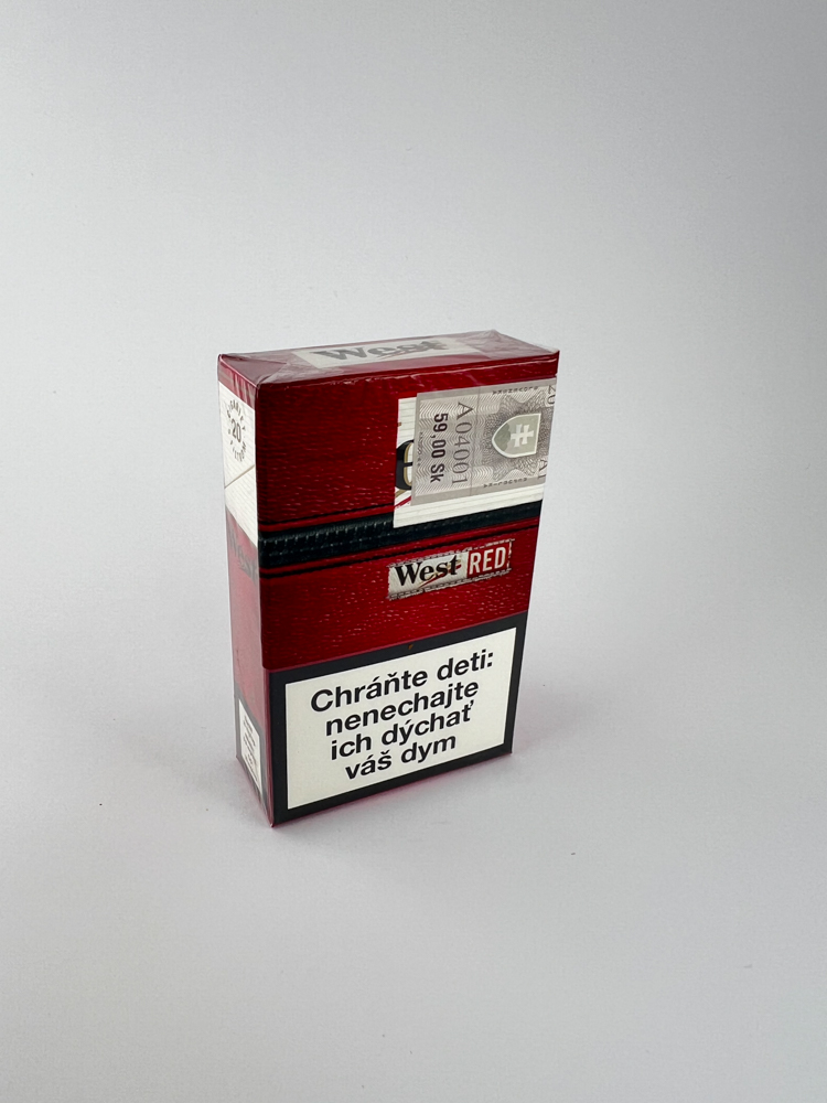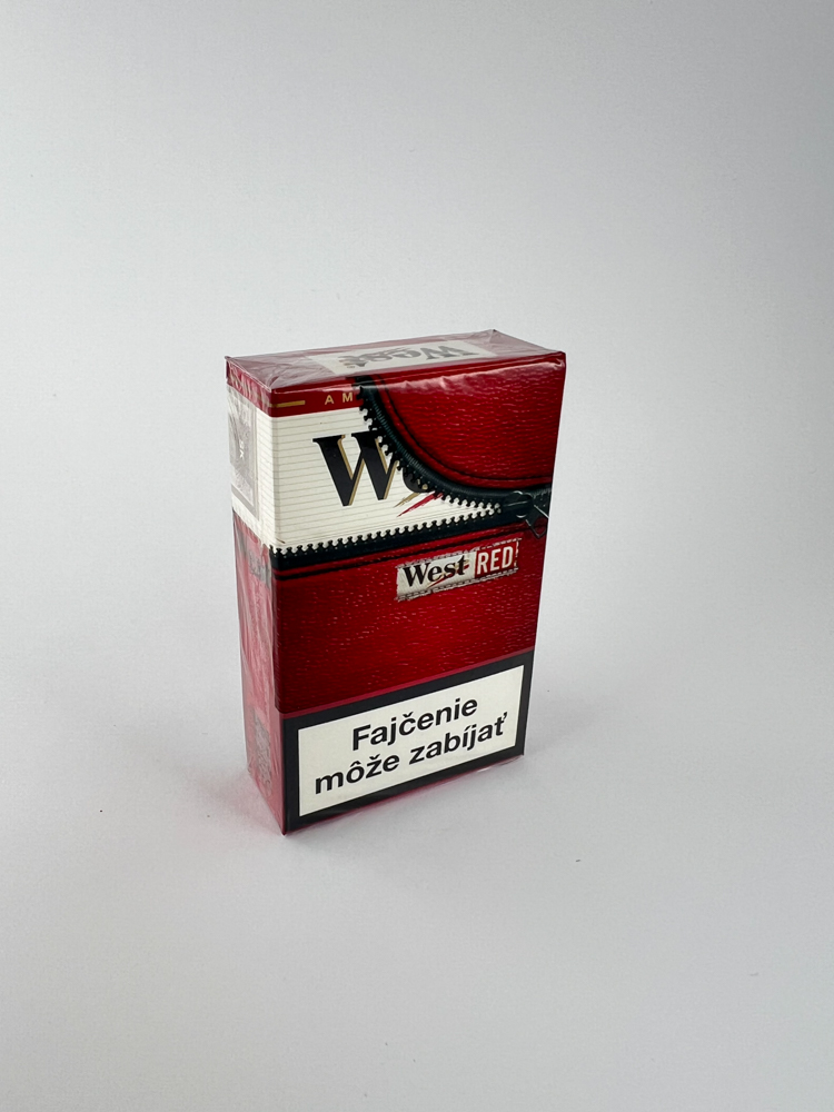 „West Red“ pakelis – ryškiai raudonas su juodais elementais ir imitacijos susiuvimu. Ant viršaus matomas baltas „West“ užrašas, apačioje papildomas „Red“ ženklu. Priekinėje dalyje – įspėjimas lietuviškai „Fajčenie môže zabíjať“, kitame šone – įspėjimas čekų kalba apie vaikų apsaugą. Būklė atrodo visiškai nepriekaištinga – supakuota plėvele, be pažeidimų.