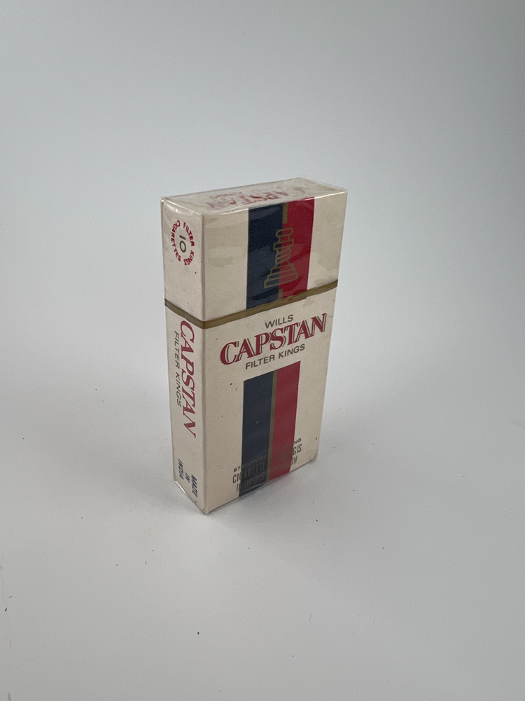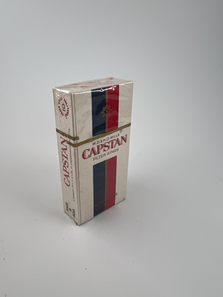 Aprašymas: Capstan yra vienas iš seniausių britų tabako prekės ženklų, o šis pakelis, pažymėtas kaip „Wills Capstan Filter Kings“, yra eksportinis leidimas, gamintas Indijoje. Dizainas išlaiko klasikinį vertikalų mėlynos, auksinės ir raudonos spalvų išdėstymą, o pakelio šonuose pateikta informacija tiek prancūzų, tiek anglų kalbomis. Ant viršaus nurodyta, kad tai „10 bâtonnets“, o tai rodo į galimą eksporto tikslą frankofoniškoms šalims. Vizualiai pakelis elegantiškas ir pasižymi nostalgišku dizainu.